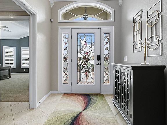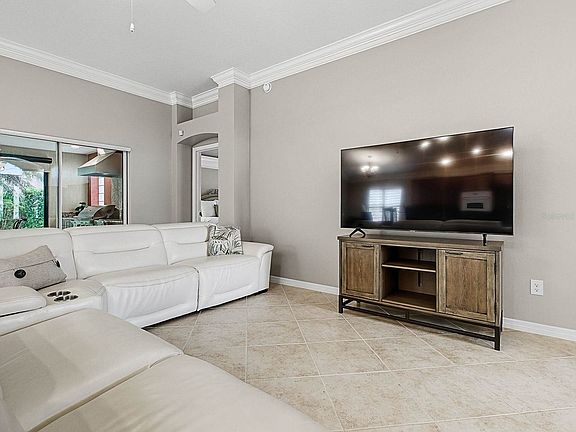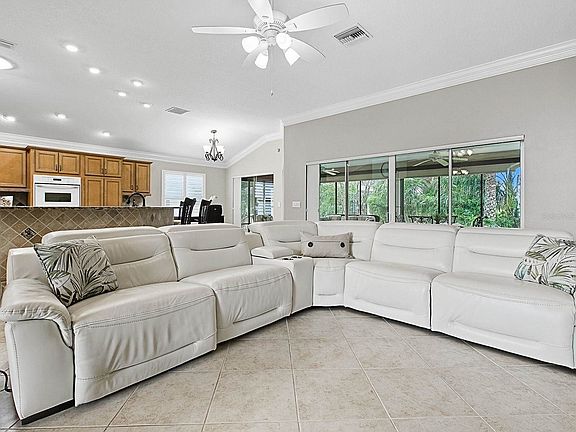 BOND PAID and TURNKEY! This stunning Designer Lily boasts a 2-Car with GOLF CART GARAGE in the Village of Tamarind Grove. From the moment you arrive, the artistic paver stone driveway and expanded patio set the tone, inviting you inside to discover more. Step inside through the decorative glass front door with sidelights into the foyer. The bright, sun-filled interior features a spacious open great room with volume ceilings, EXTENDED CROWN MOLDING, PLANTATION SHUTTERS, and tile laid on the diagonal, with cozy carpet in the bedrooms. The formal dining room has ample space to entertain guests, while the inviting breakfast nook, with a view of the lush, filtered sunlight backyard, is the perfect spot for more casual dining. A SOLAR TUBE illuminates the gourmet kitchen which is designed for both style and function. The kitchen showcases maple cabinetry with pull-outs, GRANITE countertops, tile backsplash, under-cabinet lighting, double wall ovens, and a GAS cooktop stove. A stylish breakfast bar provides even more seating with convenient foot ledge for comfort. The owner's retreat offers elegance and comfort with a tray ceiling with rope lighting, and a large walk-in closet. The primary bathroom is complete with dual sinks, a separate toilet room, and a luxurious ROMAN SHOWER. An extra-large guest bedroom is located at the front of the home, featuring a bay window and a double-door closet. A second guest bedroom also features a double-door closet and is situated just outside the guest bath. The well-appointed guest bath features a tile-lined shower with a decorative glass surround. Practicality meets convenience in the laundry room, complete with wall cabinets and a utility sink. Expansive stack-back sliding glass doors open to an oversized glass-enclosed lanai, complete with a spectacular SUMMER KITCHEN full BBQ grill and dual burner side stove, sink, mini-fridge, and permanent gas line to a buried propane tank—perfect for entertaining. The 2-car garage with TANDEM GOLF CART GARAGE is climate-controlled with an HVAC MINI-SPLIT and includes epoxy floors, pull-down attic stairs, secondary full-size refrigerator, workbench, an electronic water softener, and a WHOLE-HOUSE WATER FILTRATION SYSTEM. Additional upgrades include hideaway screen on the front door, landscape lighting, GARAGE DOOR SCREEN, lanai blinds, and fresh interior paint. Great location close to Lake Sumter Landing and Brownwood Paddock Square, Several pools and rec centers, and four executive golf courses are just a quick golf cart ride away. Shopping and Restaurants are also close by on 466A. Come fall in love and make this your next home!