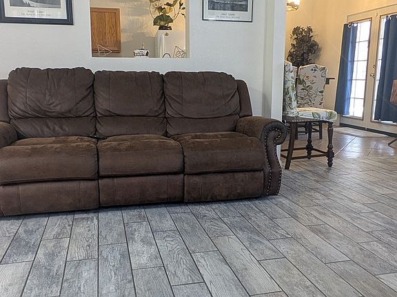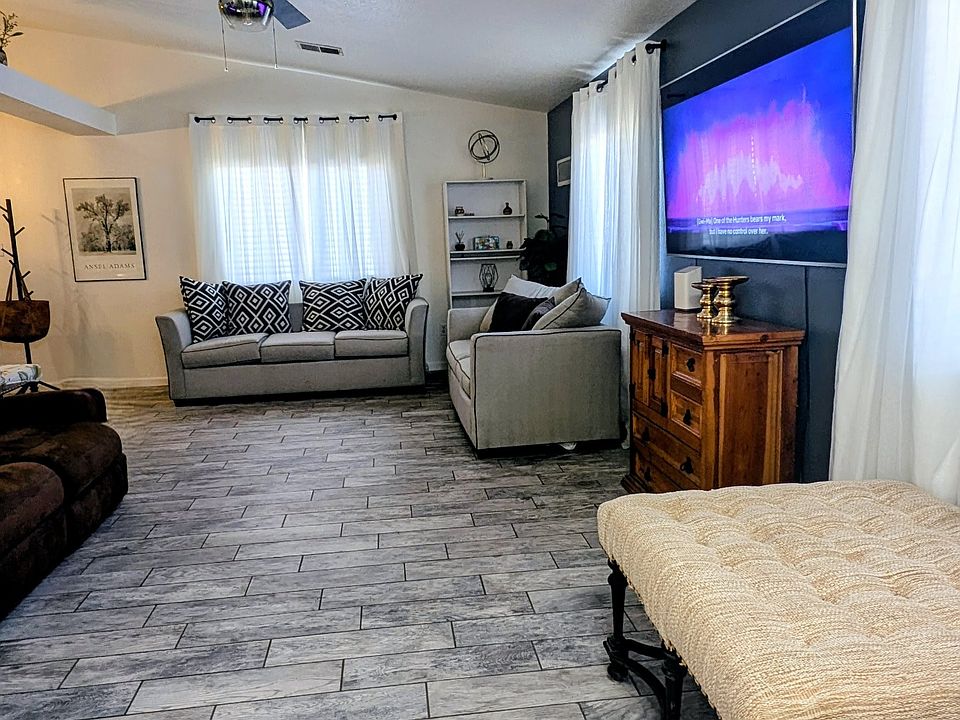 Nestled next to a cul-de-sac for added tranquility, this fully furnished well kept home with new amenities and upgrades throughout and feels like your home away from home. This fully tiled home with water softener throughout and reverse osmosis in the kitchen sink, has found fresh life with new furniture, mattresses, pillows, towels, bathroom essentials. The full kitchen comes with a brand new gas range, and new pots and pans as well. The Keurig machine allows for a quick coffee and tea break in the kitchen or the living room with the Smart TV. The workout room includes a peloton cycling bike and room to unwind in a yoga session. Blackout curtains throughout the house allow for a relaxed atmosphere no matter what time your shift ends, with each bedroom including a desk.