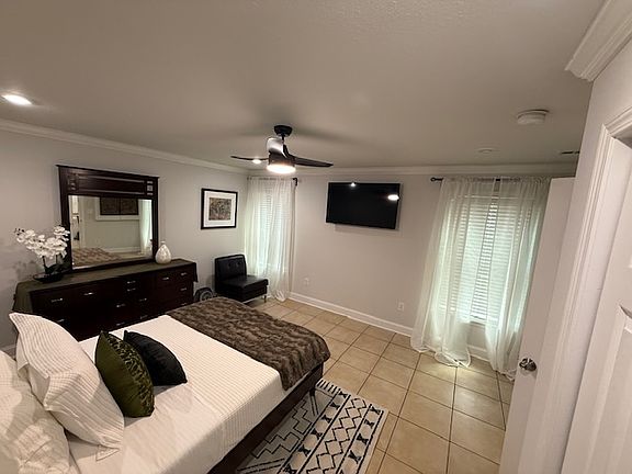 The apartment boasts a well-equipped, newly renovated bathroom complete with a walk-in shower and vanity. The kitchen and den area are designed for socializing, featuring an open kitchen layout that includes a dishwasher, seating, and a pantry. The adjoining den provides a cozy spot with a couch and TV, perfect for unwinding.