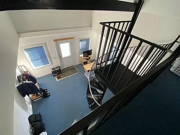 Cozy setting with the bedroom upstairs in the loft. Open concept living/kitchen. Spiral staircase to loft. Perfect bachelor/ette pad or college student.