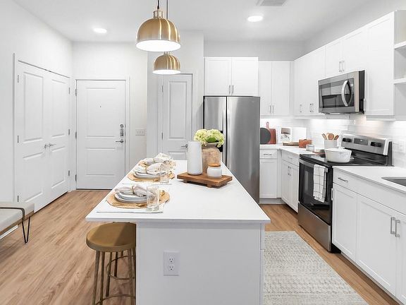 Quartz counters and stainless appliances give the kitchen a clean look, and the tall ceilings make the space feel bigger than it is. The layout is open and easy to work with, whether it's a quiet night in or friends hanging out. There's also extra storage, which is rare in this part of town.