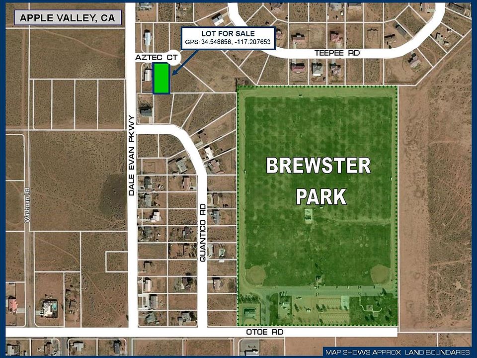 This nearly half acre parcel is located in northern Apple Valley, CA. The Town of Apple Valley is a thriving community in the High Desert that continues to grow and develop. The property sits one lot back from the Corner of Dale Evans Parkway and Aztec Ct. This is a growing neighborhood, with Brewster Sports Park nearby that is host to a variety of events throughout the year. The Town of Apple Valley has the property zoned Very Low Density Residential. Electricity is via overhead power lines, located on the south end of the property. Sewer is available via the Town of Apple Valley and water is available via Liberty Utilities.