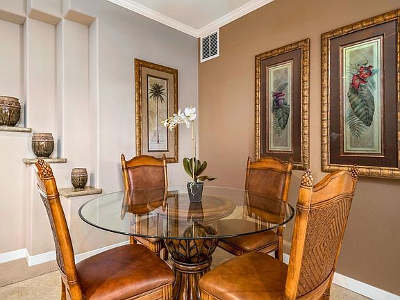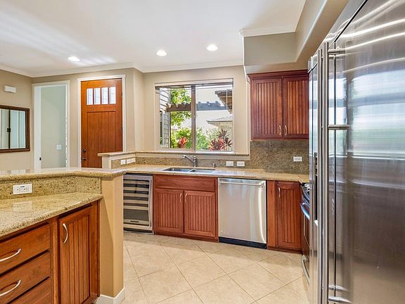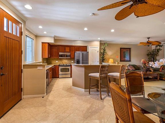 Fully furnished ground floor unit at Palm Villas at Mauna Lani. Currently the lowest priced unit in Mauna Lani, this is a great opportunity to purchase on The Big Island's Gold Coast. Palm Villas is a low density complex located steps from the Mauna Lani Spa and Fitness center. The large kitchen has bar seating, granite counter tops, stainless appliances, a wine cooler, plenty of counter space and a pantry. A comfortable dining area is located off the kitchen and there is a built in BBQ on the lanai. A detached garage is steps from the front door and the pool is close by. Can be a long or short term rental. Additional photos on the way.