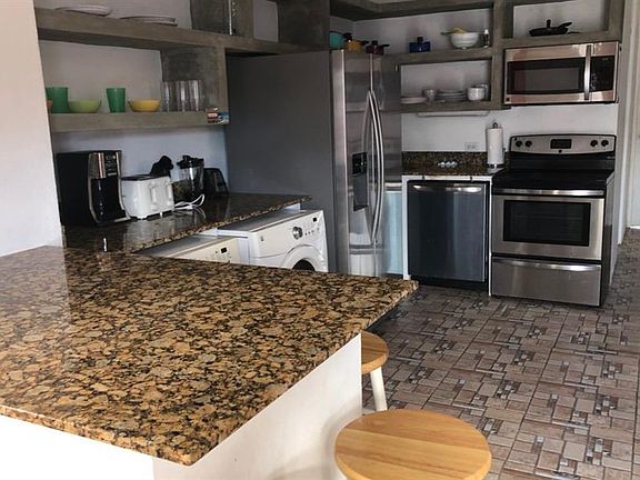 Mid Island convenience! This approx. 1,200 square foot Turnkey Concrete 3 BR/2 BATH Single-Family Residential Property on approximately 1/10 of an acre is Titled and is zoned for Residential Use. READY TO GO! Income Producing! Newly renovated spacious 3 bedroom 2 bath house with a large rear deck, small pool (5ftx12ft), and very close to the beach. The master bedroom has dual his and her sinks, a large double head walk in shower and walk in closet. All other rooms have new queen beds, AC. Split ACs in larger areas. This could easily be converted to a 2/1 with the over sized rear bedroom (exterior door) becoming a studio apt. for rentals to continue income & live in the front! Spacious great room with fully equipped , nicely designed kitchen with dishwasher and laundry. Fully furnished and turn key! Walled in and off street gated parking. Just enough yard for a couple dogs! All security doors and windows! Walk to Monte Santo Playa, 5-8 minutes. Walk to groceries and a couple eateries. All concrete, simple design, easy to maintain and an Airbnb success.