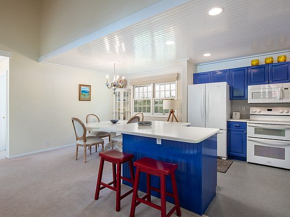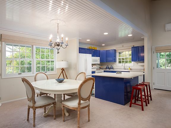 The kitchen cabinets are a deep blue matching the wood floor on the enclosed porch, the double hung windows and white louvers refreshing, and the views of Nob Hill and Mauna Kea are captivating.