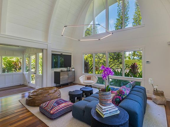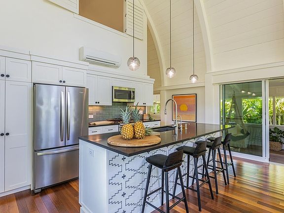 Located on Weke Rd. in the heart of Hanalei Bay, the Bounty House has long been considered an iconic landmark home. The stylish 2BD/2BA main house along with the charming 1BD/1BA guest cottage offer the simplicity of a unique turn-key opportunity. Both homes have been thoughtfully designed and outfitted with impeccable hand selected furnishings, custom built-in’s, tropical hardwood flooring and handmade artisan tiles. The Bounty’s cathedral-like ceilings and oversized windows draw an abundance of natural light and lush greenery into the heart of the home. The large screened-in lanai, surrounded by a botanical wonderland of tropical foliage, is perfect for either entertaining or relaxing with a good book. The guest quarters are nestled in the back of the property and present a unique problem… getting your guests to leave the cozy self-contained dream cottage. Upon returning from the beach across the street, the puka lava paved driveway turns into a walking path leading to an ipe-cladded private outdoor shower, a must for your post surf/swim rinse. This storybook property is ready for the owner desiring the Hanalei lifestyle that encompasses world class surf breaks, a backdrop of Hanalei's waterfall draped mountains, and the allure of one of Hawaii's most loved beach towns.