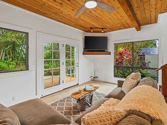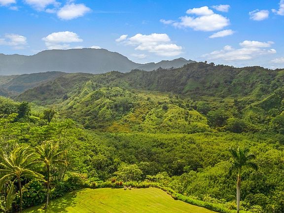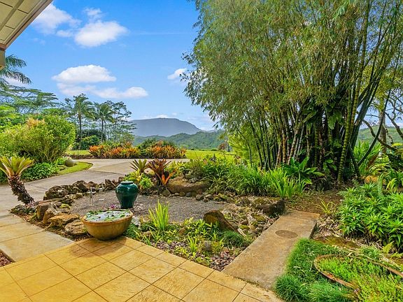 Rare 5 acre gated estate situated on a spectacular rim location with incredible views and privacy. Enjoy the peace and tranquility that surround you in your own tropical oasis. Breathtaking views over-looking the Kalihiwai River Valley and mountains beyond. This home was thoughtfully designed with an open-concept living, dining and kitchen plus half bath downstairs and 3 spacious bedrooms with 2 baths PLUS office upstairs. The traditional Craftsman style architecture features beautiful wood ceilings and large picture windows with tropical views in every direction. Oversized primary bedroom suite with walk in closet and a large screened in lanai to take in the sights and sounds of Kauai. Numerous recent upgrades throughout including updated style flooring, brand-new roof, two screened-in lanais, A/C in every room, a new photovoltaic system and a lovely outdoor shower! There is an existing outdoor shed which could be improved and would make the perfect gym, yoga studio or work from home space. This home is surrounded by mature, botanical Hawaiian gardens, a bamboo forest and lovely potted water gardens. Plenty of room to add a pool and additional Ag structures. Rustic path to the river for those who enjoy hiking. Ideal location close to many beautiful north shore beaches and just 10 minutes from shopping and dining in Kilauea town.