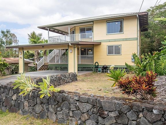 The two levels of this three bedroom + den / two bath home, each with a large covered deck, provide a flexible floor plan. Upgrades include: * High-end custom mahogany cabinets with soft-close feature in kitchen and baths * Quartz countertops * Stainless appliances * Easy care vinyl plank flooring in the kitchen and bedrooms, tiled bath floors; lower level has laminate and tile floors * Freshly painted interior, window coverings throughout, ceiling fans in nearly every room * Freshly painted exterior stairs, decks and railings Each of the two levels has its own separate entrance, its own large private covered deck and its own individual laundry Upper Level: * Large covered wrap-around deck with ocean & sunset views can be accessed from both the great room and the den/multi-purpose room * The great room includes space for living / dining and kitchen, with lots of cabinet storage, corner lazy susan, double-door refrigerator, range and microwave * Built-in custom mahogany storage credenza in living room * Floor plan also includes a bedroom, den/multi-purpose room and a bath with tub/shower combo Lower Level: * Great room includes large wet bar with refrigerator, custom cabinetry with large pantry and pull out trash/recyclables bin * Two bedrooms and a bath with tub/shower combo * Private covered entry deck with space for outside dining, relaxing. The home has an attached two-car carport along with extra driveway and on-street parking The Home is served by a Rheem on demand gas water heater; septic system Located on a private cul-de-sac at a pleasant 850' elevation with good breezes, the home is conveniently close to the Kealakehe school complex, and to Kailua town for shopping, dining, services and recreation. Landscaped yard includes rock walls, banana, ginger, colorful ti and croton plants, rhapis palm, monstera Buyer will be covered under a 1 year Home Warranty