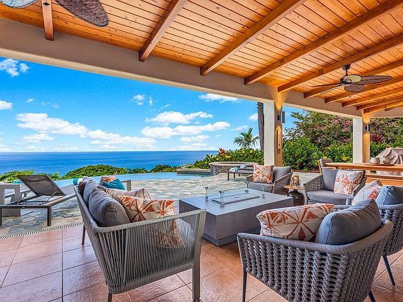 Enjoy a warm welcome at this beautifully furnished single-story home with 3 bedrooms and 3.5 baths plus office surrounded by tropical gardens and mature coffee trees on 2.5 acres. Watch the sunsets all year round, coastline and Pacific Ocean views. This home is located within the exclusive gated community called Estates at Holualoa. The thoughtful elegant details as you enter the home set the tone as you unwind in a private setting. Soaring vaulted ceilings and large pocket glass sliding doors allow soft light to glow upon the tropical entryway. Of all the rooms that fill this house, the living room feels like home. At approx. 1,000-foot elevation; the fireplace in the evening adds to a relaxing atmosphere. Each gathering space carries you through from the living room, gourmet kitchen, expansive lanai out towards the infinity-edged pool, relaxing spill-over spa to breathtaking views. For those who love to gather in the kitchen; the stainless-steel appliance’s with gas stove top is worth showing off especially for the chef at heart who loves to host friends in a great entertaining space. Island bar seating, walk in pantry, attractive cabinets with a neutral palette and subtle hints of color. An extra bonus room for office is near the kitchen with built in shelves for reading books and desk top for inspiration with its own window to enjoy the outdoor elements. Each luxury bedroom has a quiet and tranquil space with its own bathroom and separate peaceful lanai for retreat in your own private setting. The master bedroom has comfortable bedding and a writing desk under a beautiful window overlooking the coastline. The master bathroom is a beautiful example of a spa-like retreat with warm natural lighting and white spacious tub. Photo voltaic net-metering solar panels and solar hot water make this a low energy efficient home. The seller has an agreement with Queen Coffee Company to manage and maintain all coffee trees on the property.
