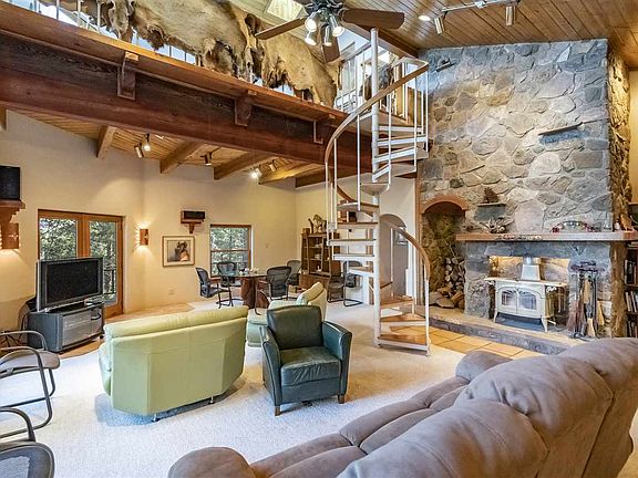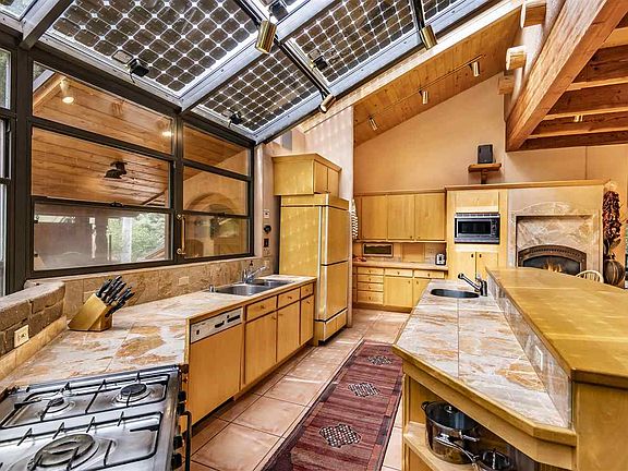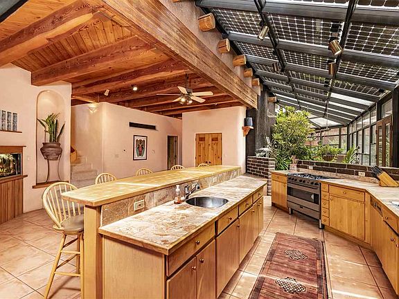 One-of-a-Kind in the Angel Fire Resort, Angel Fire, NM. In total seclusion on 48 +/- forested acres in the Southern Rockies of northern New Mexico, proudly stands the elegant "Heavenly Retreat". Many years in creation by two renewable energy entrepreneurs, this green-design showplace is a tribute to renewable energy. With straight-on views of the majestic Wheeler Range and Eagle Nest Lake, the three-story passive and active solar home features 4 kW solar electric and solar thermal heating (180,000 Btus/hr) for all hot water needs. Every floor surface is controlled individually with comfort controls. Three interior greenhouses produce tropicals, herbs and vegetables in solar-thermal heated soils. Meadows, live water and terraced gardens are just a few of the exterior features. This home has it all: traditional vigas, large beams, and vaulted ceilings constructed from native materials, all hand-crafted by various renowned local area artists. Four spacious bedrooms and 3 baths, a flowing open solar kitchen with attached interior greenhouse for entertaining, a large office and four fireplaces are just some of the features of the main house. Guest quarters with a separate entry include an additional bedroom and bath, living area and complete kitchen with views out to the forest and mountains. Along with the approximately 5,300 square feet of finished living space on the top two floors and a separate 900 square-foot guest quarters on the first floor, is approximately 2500 square feet of heated space on the first floor, now used for storage, and a partially-finished fifth bedroom or game room. The heated geodesic domed garage has a large loft that provides many creative uses as well. With the way we work rapidly changing in this new world, second generation fiber-internet makes it possible to work from home in the stress-free southern Rocky Mountains of northern New Mexico. Ski on your lunch hour. In driving distance from Texas, Oklahoma, Kansas, Colorado, Arizona, etc. This property is unique, one-of-a-kind built by forward-thinking entrepreneurs with renewable energy always at the fore-front.