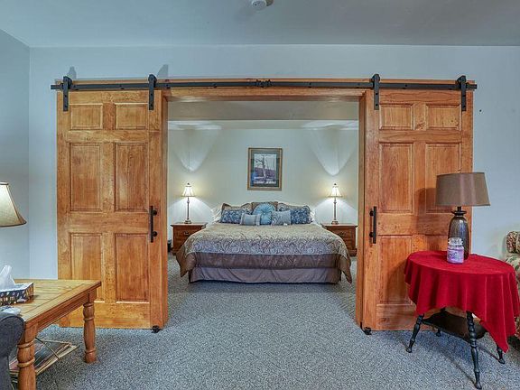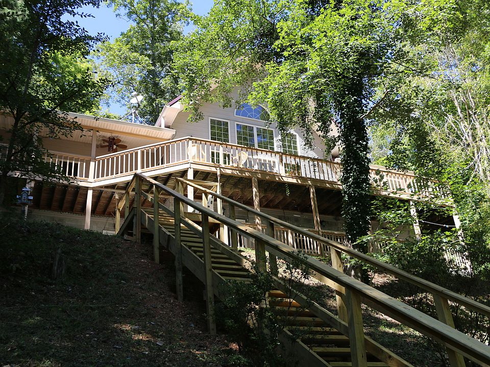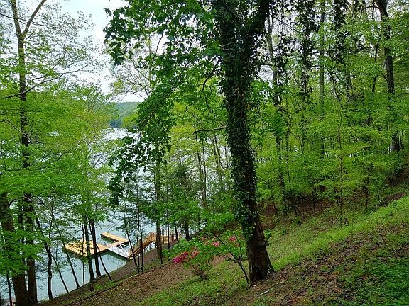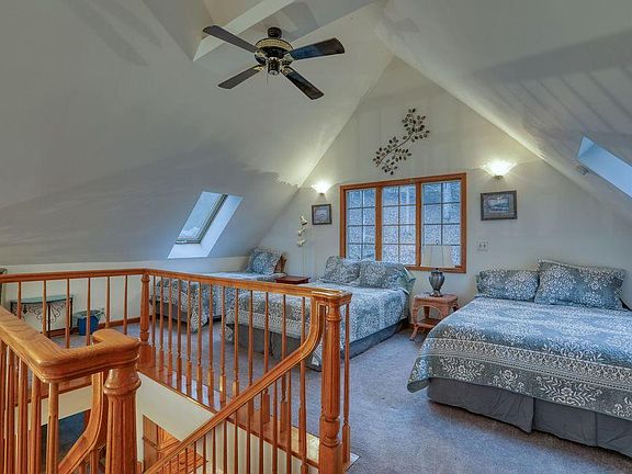 Nestled in the woods on 2+ private acres open, 1990 charmer w/ 2500+ sqft on 3 levels. Massive loft + four bdrms (including main level master)-possible to sleep up to 18! Natural light in the 2-story great room with floor to ceiling, lake-facing windows. Enclosed three season porch off the kitchen/dining area, three-sided fireplace opens to the great room. Master bedroom w/ private walk-out to balcony w/ lakeview & an adjoining newly-reno bath and first floor laundry room. Second bath and family room in the lower level. Large circle driveway provides ideal for parking 10-12 vehicles and/or watercraft trailers, outdoor firepit on the landing, and steps to the lakefront dock. The dock w/ ladder and single uncovered slip & room for watercraft on either side. $65K 1st year rental history