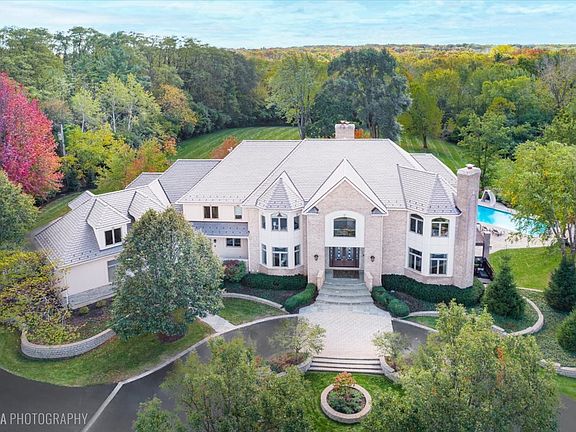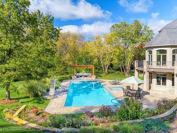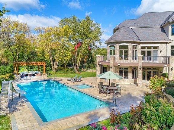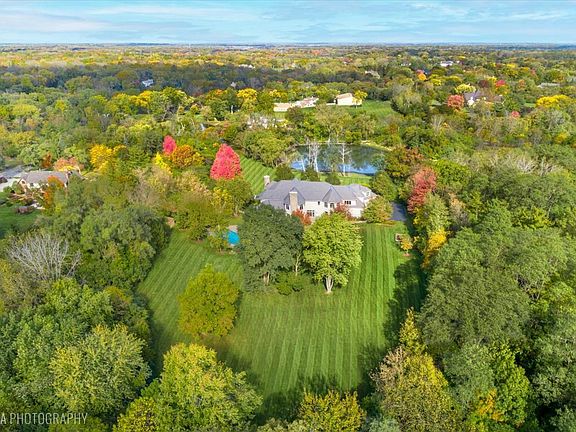 Discover resort-style living in this spectacular Barrington Hills estate, privately set on 5.5+ prime acres along prestigious Brinker Road. Behind the gated entrance, this architectural masterpiece offers over 11,000 square feet of refined living space across three levels, all served by dual staircases and an elevator. An outdoor sanctuary with manicured grounds, a scenic pond, and a stunning 50-foot pool with integral hot tub, this estate combines elegant architectural detail with every modern luxury. Step through the custom double doors into a grand two-story foyer with limestone floors and a sweeping curved staircase flanked by spacious living and dining rooms, perfect for elegant entertaining. The gourmet kitchen is a culinary dream, featuring dual-tone cherry cabinetry, Sub-Zero, Thermador and Bosch appliances, an expansive granite island, butler's and walk-in pantries. Flowing seamlessly to the breakfast room with access to the rear deck and the great room with soaring ceilings, limestone fireplace, and walls of windows overlooking the resort-like backyard. An inviting study with cherry wood built-ins and a wet bar, an elegant dining room with butler's pantry, and an airy sunroom with vaulted turret ceiling highlight the main level. Upstairs, two primary suites provide unparalleled comfort boasting radiant-heated spa baths and walk-in closets with custom organizers. The first suite features a sitting area with cozy fireplace while the second offers versatile bonus space perfect for guest, in-laws or a private retreat. Two additional en-suite bedrooms and a library bridge overlooking the dramatic foyer below complete this well-appointed space. The walkout lower level is an entertainer's dream, thoughtfully designed for relaxation and recreation alike with radiant heated floors for year-round comfort. Enjoy lively gatherings in the expansive recreation and game rooms, appetizers and drinks at the stylish kitchenette / wet bar, or unwind in the inviting family room with fireplace or in the home theater. A private fitness room, fifth bedroom, and full bath add comfort and convenience, while a luxurious spa suite with sauna and steam shower offers the ultimate retreat. Outdoors, enjoy multiple bluestone and brick patios, a built-in grill, firepit, pergola lounge, and landscape lighting that creates a magical ambiance. Additional exterior features include a fenced property with electronic gate access and 32-zone irrigation system lawn and planting areas. The attached, heated 4+ car garage includes an EV charger and custom storage. Recent upgrades include a DaVinci composite slate roof (2025), new gutters (2024), and updated mechanicals for ultimate peace of mind. With a location just minutes to town, train, shopping, and award winning D220 schools, this is a rare opportunity to own one of Barrington Hills most distinguished estates seamlessly blending craftsmanship, privacy, and luxury.