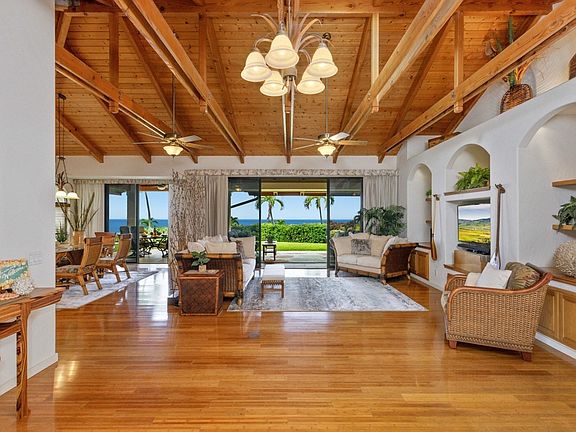 Come home to easy living in this 3 bedroom 2 bath home in the highly desirable Bayview Estates. Perfectly situated at the back of the neighborhood with open green space behind for privacy. True to its name, it has those blue ocean views from where it sits perched on the hill over Keauhou Bay. Solid bamboo floors through main living area add tropical warmth, along with the wood open beam ceilings and wood louvered interior doors. Light streams in through the three sets of large glass Fleetwood sliding doors, opening up the interior to the outdoors for lovely ocean breezes. Kitchen and baths all have solid wood cabinets and granite counter tops. Four new exterior covered lanai areas were added to expand the outdoor living space to 1090 sf. The added BBQ area at the back allows for cooking so smoke is away from your guests and party. There is also an outdoor shower to wash off after the beach. Head to the upper terrace behind home for some limes, mangos, and grapefruits. The 2 car garage has a sparkling new epoxy floor finish. Energy efficient and low bills with solar hot water and fully owned Net Metered 15 PV solar panels. The secure and gated community makes this ideal for a Hawaii get-away home or go all the way and make it your permeant full time residence. Just bring your aloha! Take a look at our 3D Matterport tour: http://bit.ly/Aumoe3DTour Please do not disturb owners without appointment. Mahalo