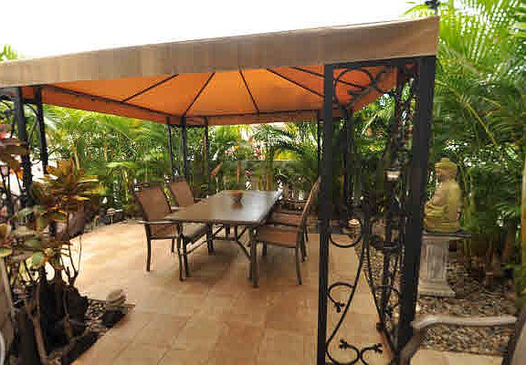 Fabulous ground floor end unit. Tiled lanai and very private setting surrounded with palms and has covered area for outdoor dining. Fabulous Designer furnishings are included along with a fully stocked kitchen. Includes 2 bedroom's, the master suite is decadent with king size bed and the second bedroom is furnished as an office. Walk to the beach or town from this highly desirable complex known as Alii Lani. The following items have been up graded- Granite counter tops and glass tile back splash in kitchen, new kitchen range. New carpeting Travertine flooring, Custom paint, designer shower doors, tiled lanai. Easy to see!