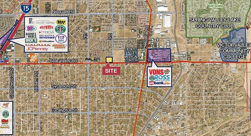This 8.65-acre site is located between 24 Hour Fitness and Desert Valley Hospital on Bear Valley Road in Hesperia, CA. The High Desert is now the future home of the recently approved High Speed Train from Apple Valley to Las Vegas, including their Maintenance Facilities. This project is expected to break ground in the Victor Valley during 2020, and be completed in 2023. Over the course of the next three years, the project is expected to bring in over 10,000 jobs, increase housing needs, and boost the economy of the High Desert. The Site is less than 2.5 miles away from Interstate-15. 630 feet of frontage on Bear Valley Rd, Major East/West Corridor in the High Desert. Property is zoned C2-T (General Commercial Transitional).