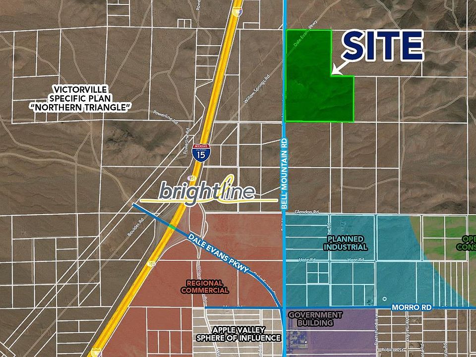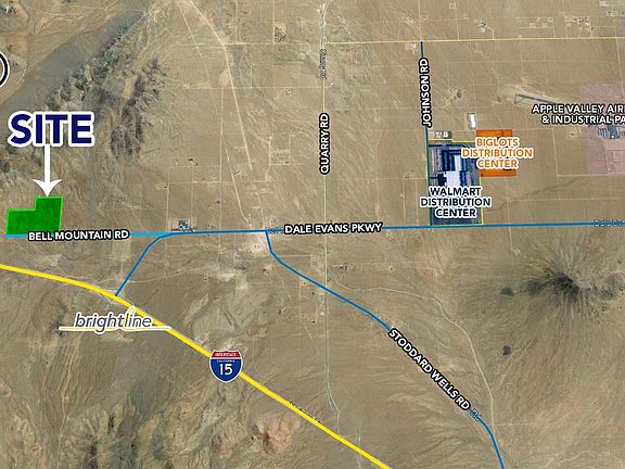 INCOME PRODUCING PROPERTY/CELL TOWERS -Visible from I-15 - Just North of Dale Evans & I-15 Interchange - Average Daily Traffic is 55,000. Property is North of the Planned Brightline Train Station anticipated to break ground 3RD Quarter 2021 and now extended to 2022. South of this location is the Town of Apple Valley Industrial Park & the 1,250,000 SF Wal-Mart Distribution Center and the Big Lots Distribution Center. Buyer to conduct all Due Diligence with the County of San Bernardino. Within the sphere of influence to the Town of Apple Valley.