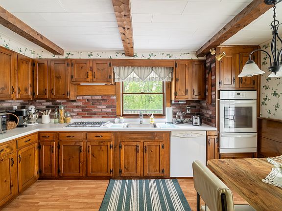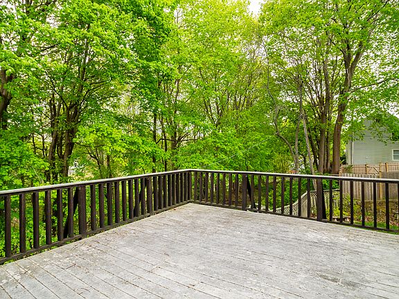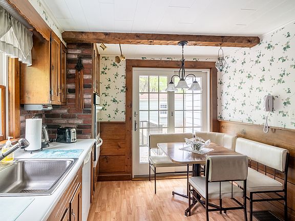 Deck and patioDining roomKitchen with gas stoveEat in nookCozy cottage styleOverlooking wooded conservation land