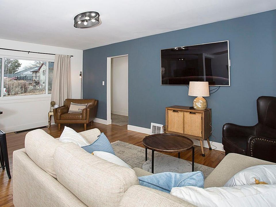 The Perfect and fully stocked White Kitchen is Open to living room, has an eating area and room for 3 at the big black granite island; new white cabinets, marble backsplash, and new stainless appliances. The living room has newly refinished hardwood floors, Big Screen TV, comfy sectional and reading area. The all- new main floor bathroom has tub and shower, slate floors, and stylish grey and white shower tile. The two generous sized main floor bedrooms have hardwood floors, loads of closet space, TVs, and comfy queen beds.