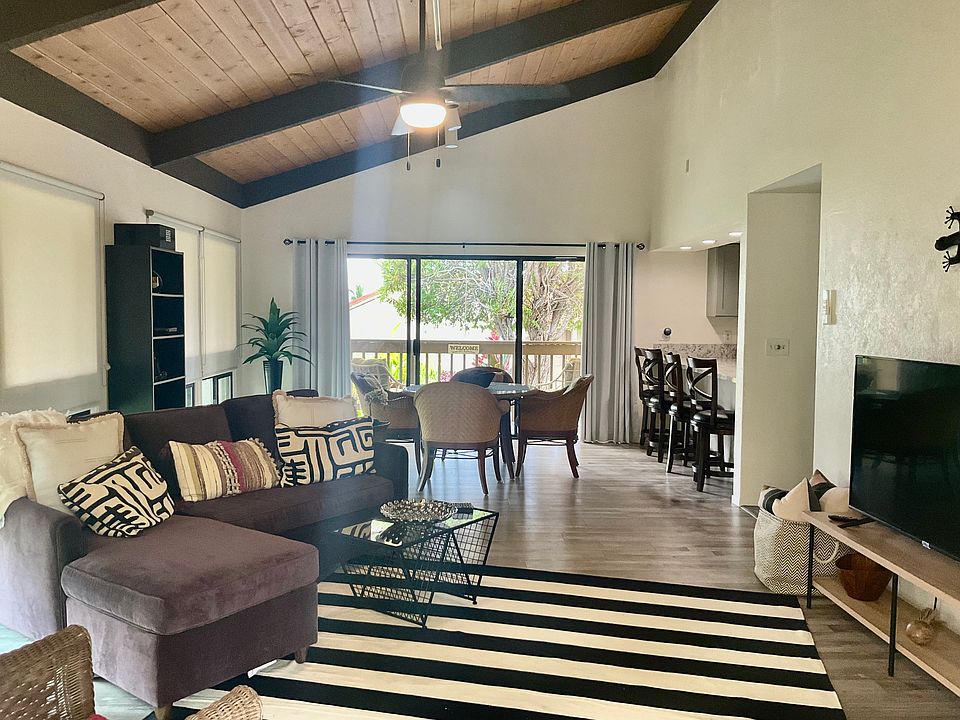 Very unique condo. Two living areas. As you enter there is a living room that could be used as a business such as real estate office, hair salon, yoga studio, etc. Four steps up and you have another living area with kitchen and dining area. There is a loft upstairs, which is accessible by an exterior stairway. First floor is 1571 sf, and loft area is 741 sf, with a total square footage of 2312. Please note that county of Hawaii records differ from the actual number of bedrooms, baths, and square footage.