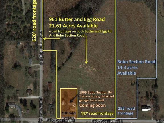 Opportunity to own 21.61 acres that fronts on Butter and Egg Road as well as Bobo Section Road. Additional 14.3 acre parcel on Bobo Section Road available. Also home, detached garage and barn on 1 acre available.
