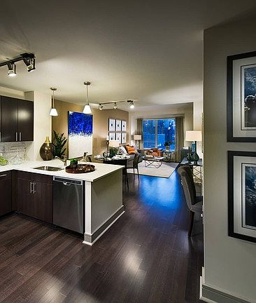 Sleek modern kitchenHardwood floorsGranite countertopsStainless steel appliancesLarge floor-to-ceiling windows