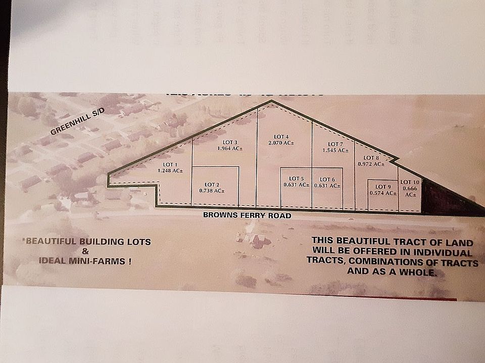10 lots to be sold as a whole from 1/2 ac. to 2 ac. 10.0 ac.+- call 256 497 3637 for more information