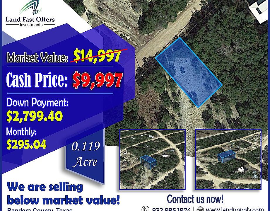 A Dreamy 0.12-Acre Plot in Bandera County, TX! With Road Frontage and Nearby Power Lines! If you’re looking for a place to just get away from it all – the hustle and bustle of the big cities, the pressuring deadlines, and just about every trouble in your everyday life – then we got a lot that’s just for you! Cozily snuggled along the tree lines of Bushy Creek Rd, this 0.115-acre lot in Lake Medina Shores – a community east of San Antonio – enjoys the convenience of having a powerline already installed in the area alongside pristine surroundings. A city rich in history and booming with modern attractions, San Antonio invites visitors to be inspired, be curious and be hungry. Walk, bike, hike and play through the city’s spectacular parks, gardens, and outdoor spaces. Experience the city’s historical significance through tours, festivals, and seasonal events. Shop, drink and dine at local favorites across the community’s diverse neighborhoods. Call us now! 832.995.1974 Pricing Details: Cash Price: $9,997 Down Payment: $2,799.40 Monthly: $295.04 Property Details: Parcel Number: 149059 County: Bandera State: TX Parcel Size: 0.12 City: Bandera Zip Code: 78003 Center GPS Coordinates: 29.6419, -99.0005 Corner GPS Coordinates: 29.642, -99.0006 29.6421, -99.0005 29.6418, -99.0003 29.6418, -99.0004 Elevation: 1243.4 feet Property Access: Paved Road *Disclaimer Buyer must perform their own due diligence they should do with any land purchase. This property is an assignment of contract and sold as-is and all information provided is to the best of the seller's knowledge. Seller does not guarantee the accuracy of the property location on maps or descriptions shown in listing as well as facts describing the property. Buyer to verify all details of the property including property location and boundaries and lot lines, as well as feasibility to use the property for buyers desired purpose. Many of the pictures provided are not personally taken by the seller and some of the presented pictures represent the general area near/around the property. All utilities related to this property are potentially subject to a connection charge or additional expense to bring them to or onto the property. Furthermore, It is understood and agreed to by the parties involved that the selling party, while holding an equitable interest in and to the property, is not presently making, and has not made, any representation to any party that it holds legal title in and to the property. To the fullest extent permitted by law, the Buyer hereby agrees to waive, release and forever discharge landnopoly dot com, Landnopoly dot com, and all its affiliate companies from any claim, be it at law or in equity, that the Buyer, their heirs, transferees, assigns, subrogees, devisees, and agents may allege, arising out of our disclosure(s) of its present interest in and to the property, if any as well as out of any potential and accidental discrepancies in lot lines, pictures or property location to the actual property.