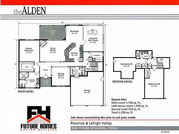 The Alden is a roomy 2 story home featuring a first floor master bedroom suite and 2 additional bedrooms on the second floor. The home also features a large great room and breakfast area with sliding door that leads to a covered patio. Future Homes offer buyers of new construction homes extraordinary value and an unmatched final product. Our custom and luxury homes are completely customizable by you the homebuyer. With our convenient showroom, vast selection or samples, and wealth of experience, we can assist you in designing the home or your dreams. The listed price is for the home only. The lot price, well, septic and stormwater costs are not included in the model prices listed as they vary with depending on the lot.