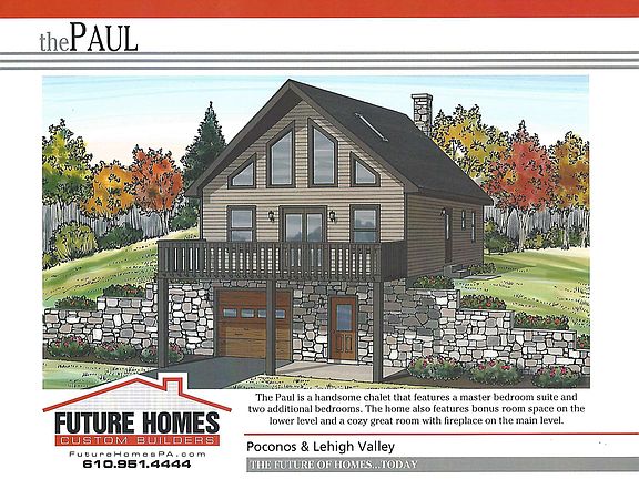The Paul is a handsome chalet that features a master bedroom suite and two additional bedrooms. The home also features bonus room space on the lower level and a cozy great room with fireplace on the main level. Future Homes offer buyers of new construction homes extraordinary value and an unmatched final product. Our custom and luxury homes are completely customizable by you the homebuyer. With our convenient showroom, vast selection or samples, and wealth of experience, we can assist you in designing the home or your dreams. The listed price is for the home only. The lot price, well, septic and stormwater costs are not included in the model prices listed as they vary with depending on the lot.