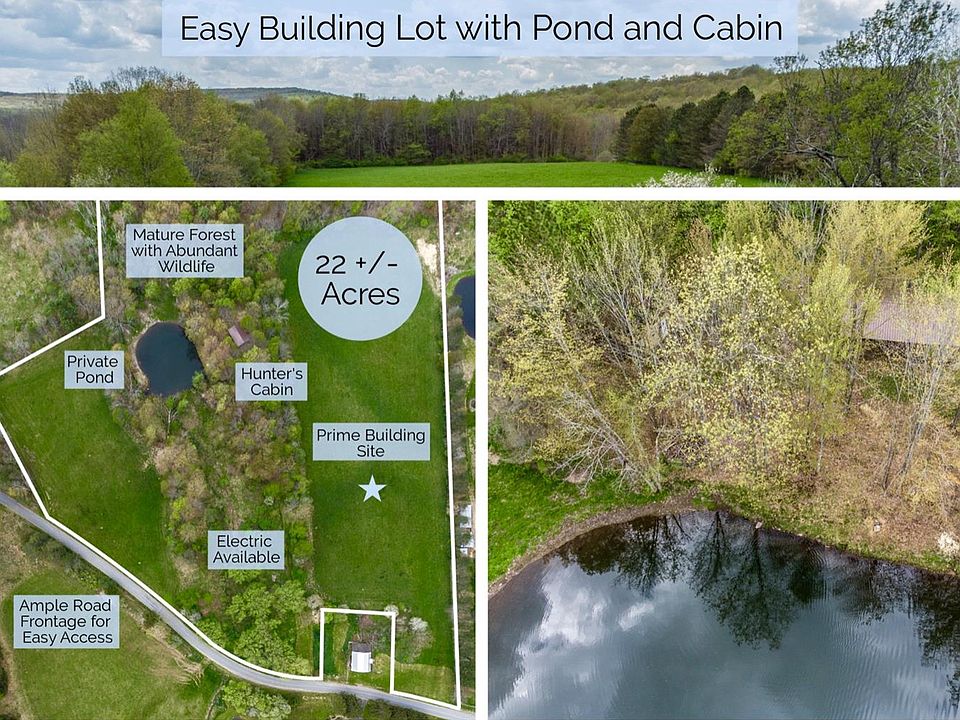 If you're looking for your own private pond and some acreage, this property has all that and more. The private pond is tucked back from the quiet country road and surrounded by a meadow and forest. There is a small hunter's cabin with a wood stove and propane water heater. It has been used by youngsters in the past for camping and by adults for cookouts, keeping warm during hockey nights, and early morning hunting excursions. Additionally, a large pavilion provides a dry space to spend time, rain or shine. This property is perfect for fishing, hunting, ice skating, sledding, snowmobiling, hiking, birdwatching, and more. The site is set up with an access road so it will be a breeze to park an RV by the pond or to build your dream house in the field or pasture. The lot is about 70% mature forest and 30% open field stretching out to the road -- perfect for hay or for planting other crops. There is plenty of space for a subdivision if one desires to build two homes, or keep one lot and sell the other. Electric and high-speed internet ara available at the road. The land appears suitable for modern septic installation. Wildlife is abundant - water species, fish, and mammals throughout the fields and woods. Many deer, turkeys, and birds. Located just 3 hours from NYC this property offers many opportunities for outdoor relaxation and recreation. Cooperstown with its many baseball attractions is under a 60-minute drive and Oneonta is just 30 minutes away with its many shopping options. Don't wait to jump on this amazing property!