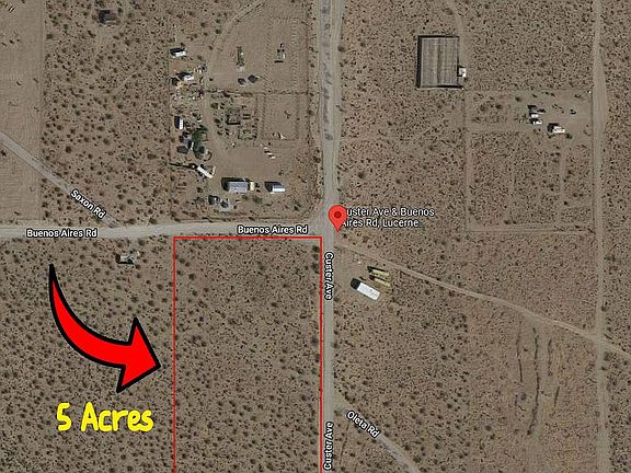Beautiful 5 acres of land in Lucerne Valley, Buenos Aires Rd. Build your dream ranch or homestead! Easy access to this property, paved road is not far from property. Parcel is mostly flat. No utilities however power access is nearby. Many houses around the area as seen on google maps, street view. Great area to live off the grid in California!