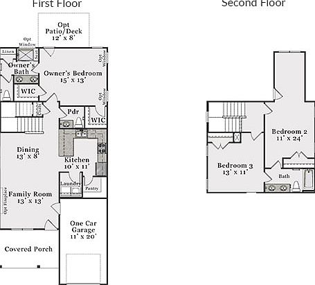 The Joyner 3 bed, 2.5 bath floor plan is intelligently designed for open living. As you enter the home from the covered front porch, you experience the inviting space with large family and dining rooms ready for family fun and entertaining. The thoughtfully laid-out kitchen has everything you need with plenty of cabinet space, bar top with seating and an ample panty with wrap-around shelves. The owner's suite, conveniently located on the first floor, features a sizable bathroom with dual-sink vanity, linen closet, shower, and separate water closet as well as a spacious walk-in closet. The laundry room and single garage finish out the first floor. The secondary bedroom has an extension making it 24 feet long. This flex space is suitable for an exercise room, playroom, office, or whatever your family may need. The third bedroom and guest bath with dual-sink vanity finish out the second floor. Options include a patio/deck and exterior door off the owner's bedroom which can be covered and even converted into a screened porch. If you want even more outdoor living space, the Joyner includes an extended patio/deck option. The owner's bed and bath also include options for additional windows. Elevation C showcases horizontal siding with shake shingles on the large second-story front gable. The covered porch, exterior details and beautiful stonework on the front wall of the garage give this elevation a distinctly elegant look.