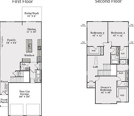 The Bowen 3 bedroom, 2.5 bath floor plan is designed for open living. The first floor features a grand family room connected to an open dining area and versatile kitchen with substantial chef's island. The ample two-car garage has separate doors for each bay. As you ascend the stairway to the second floor, you enter a roomy open loft area with linen closet that separates the owner's suite from two additional bedrooms, both with walk-in closets. The owner's suite features a sizable bathroom with dual-sink vanity, shower, and separate water closet as well as a spacious walk-in closet that will fit both his and hers wardrobes. Options include additional windows in the secondary bedrooms as well as converting the rear patio/deck into a covered or screened porch. There is also an extended patio/deck option that doubles the square footage of the rear patio/deck. Elevation B boasts horizontal siding, a louvered gable vent, and brick on the front garage wall for a traditional look.