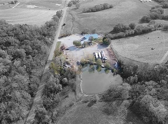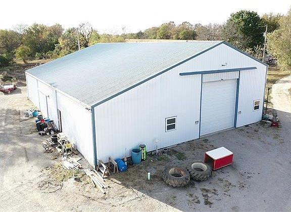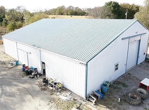 Quick highway access for this 2 bedroom home sitting on 3 m/l acres! All one level living with very large family & living room. Laundry is located off the kitchen with shelves for pantry. Beside the home, is a clean concrete root cellar. The 50x80 outbuilding features heated, concrete floors, fully insulated, 200 amp electrical service, bathroom, concession area and office space. It boasts two 17-foot doors with openers and a covered, enclosed lean-to area. A mezzanine runs the length of the building for extra storage. The outbuilding was used for an auction business, but bring your own business. The possibilities are endless. Lots of gravel for parking, either for your business or guests! This property is so close to all the Lawson community has to offer !!