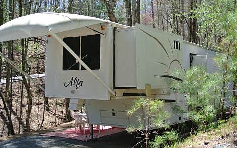 2005 ALFA 37ft offers Slide outs, king bed & queen pull out couch bed, island counter and double sink in kitchen, shower stall & sink in bath, TWO (2) 10 cubic foot house refrigerators less than a year old, 20 gallon water heater also less than a year old, 15 BTU split air conditioner, 32 LED TV, DVD player, built-in desk below TV. fire pit, outdoor furniture. Nice wooded lot is included. Located in a gated community with pools, clubhouse, river access, tennis.
