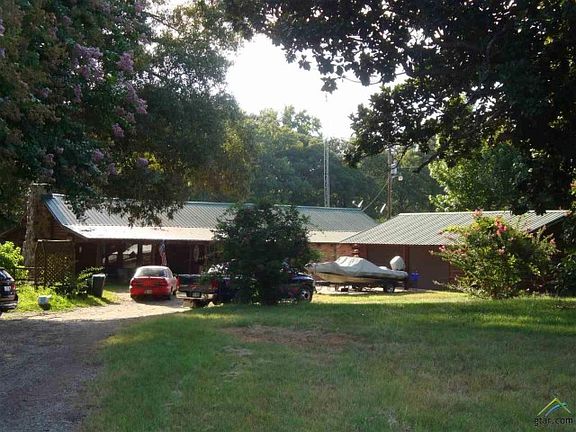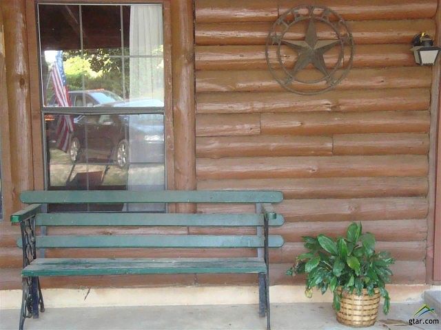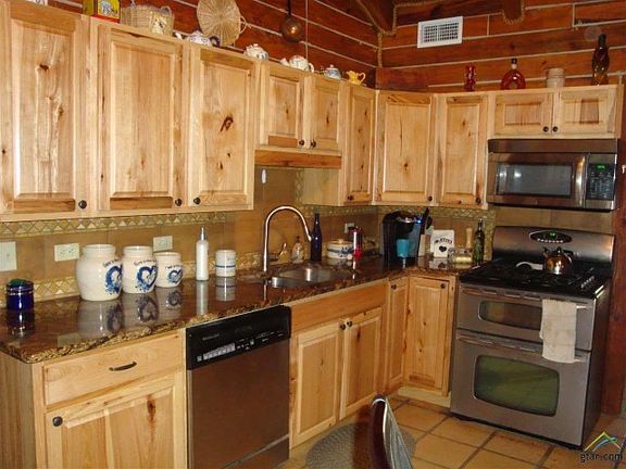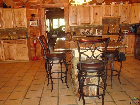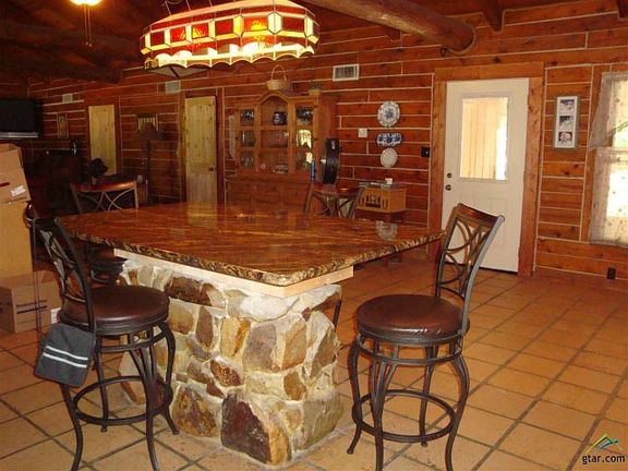 Perfect country living! 1985 3/2 log and brick home with metal roof. 2760', open floor kitchen to great room with knotty pine walls, tile floors, and floor to ceiling stone WBFP with blower. Vaulted ceiling has beautiful log beams. Lots of windows. Kitchen has new hickory cabinetry, custom stone backsplash, granite on counters and large stone island with granite top. S/S appliances and 5 burner gas cooktop. Hickory hutch built-in in dining area. New lighting and ceiling fans. Walk-in pantry and large utility room off kitchen. All bedrooms have knotty pine walls and new carpet. Master bath has custom stone/tile shower and jetted garden tub. Sunroom goes out to covered porch with view of the saltwater pool and hot tub. Detached 2 car garage and shop are log with metal roof. There is a large red barn with cement floors, insulated, 4 stalls w/sliding gates, loft, and work tables. Property is cross-fenced, large pond w/damn and creek. Producing pecan, pear, peach, plum trees.