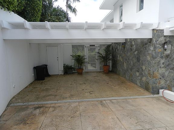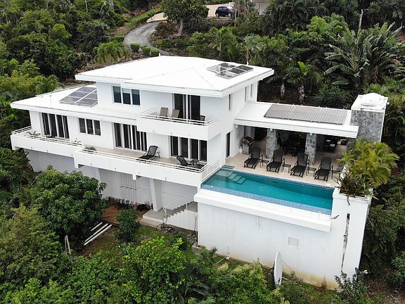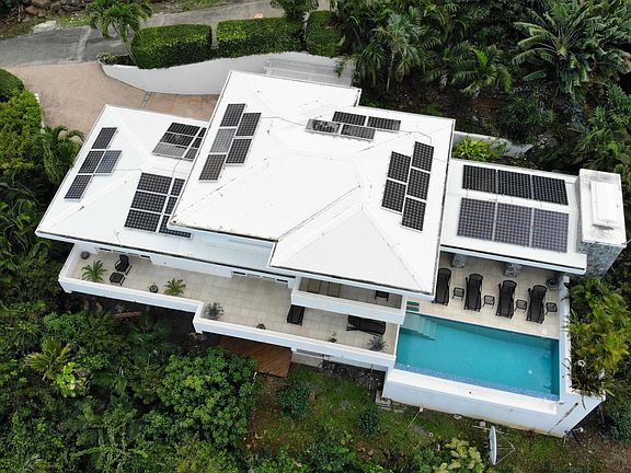 This elegant,crisp, modern West Indian design by Architect Kevin Qualls, featuring EXTENSIVE SOLAR ARRAY, is pristine. From a tasteful covered parking portico, entry is through a tranquil garden, and opens onto a stone columned covered patio, sweeping down island view and infinity pool. Breathtaking Aqua and emerald hues filter into every room, purposefully designed to catch maximum light and tradewinds. Extensive full length glass sliders, hide away in pockets enhancing the ocean vista. Open style Great Room/Kitchen design add expansive feel. A generous master suite and ''vacation'' office privately adjoin Great room. 2 ensuite bedrooms, perched above greatroom, ensure privacy. Huge lower level under Greatroom can be a large media room, Gym combination, or a giant 4th BR suite. Extras
