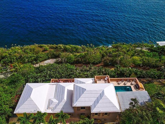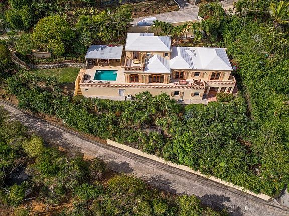 Villa Harmony, in gated Mahogany Run, is a very successful vacation villa or the perfect large family home offering 5 bedrooms, 3 1/2 baths, living room, dining room, kitchen and large office on three floors with fantastic outdoor entertaining spaces. Walk out of the main level to the 12' X 18' heated pool and poolside pergola dining and the flat landscaped yard. Solid concrete home including the roof, built to the highest standards by the original homeowner who was a concrete executive.