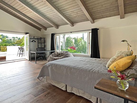 This one-of-a-kind, creative loft-style residence occupies the entire top floor of a hilltop estate featuring its own private entrance and three secluded decks. Located in an exclusive gated community on 1.5 acres nestled in the hills of Calabasas, it offers a rare blend of privacy, openness, and breathtaking surroundings. Spanning 2,000 sq. ft., this versatile living space includes a huge 1,000 sq. ft. studio + kitchen & full bath, complemented by an expansive 1,000 sq. ft. master bedroom/master bath + two walk in closets.