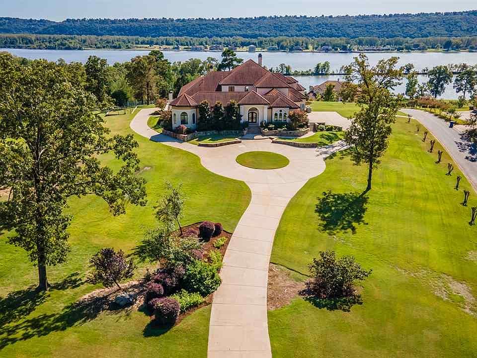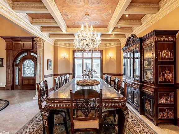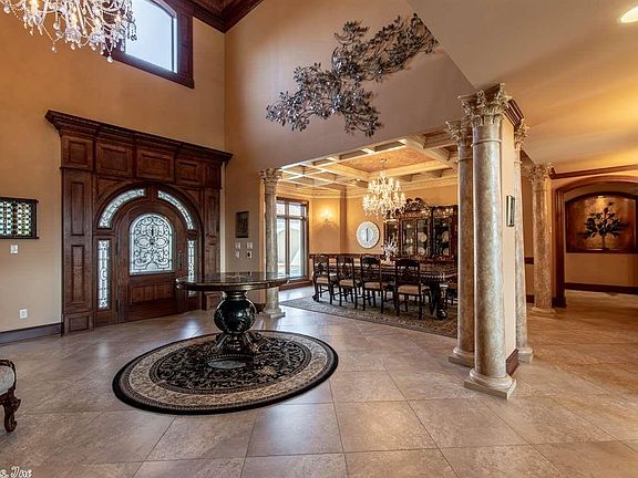 Stunning Mediterranean Estate with River Views! Grand entry w/ Swarovski crystal chandelier & gorgeous staircase. Great room features vaulted ceiling & ornate hearth. Gourmet kitchen w/ hearthroom has Thermador dishwasher & cmrcl range plus GE Monogram Fridge & Freezer. So many custom upgrades & details; 9 ft cherry wood doors, coffered ceiling & hand painted columns in dining, inlaw qtrs, theater room, Pella windows, heated saltwater pool, new tankless water heater, extra insultaion, outdoor cooktop, etc.
