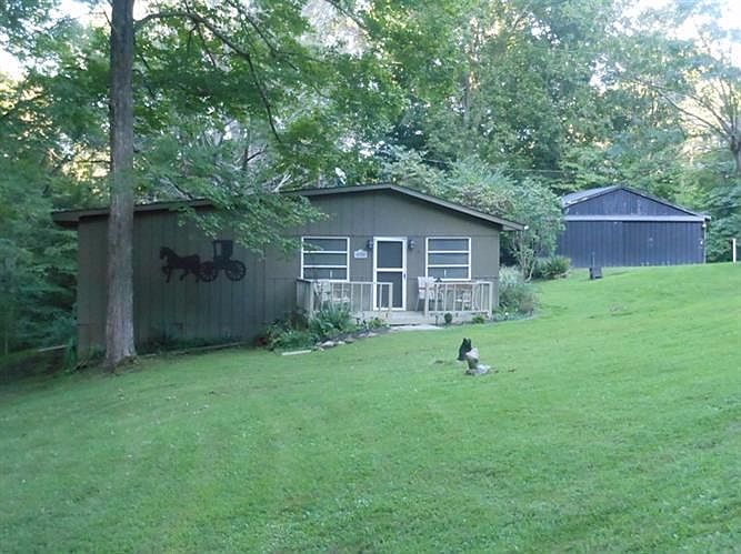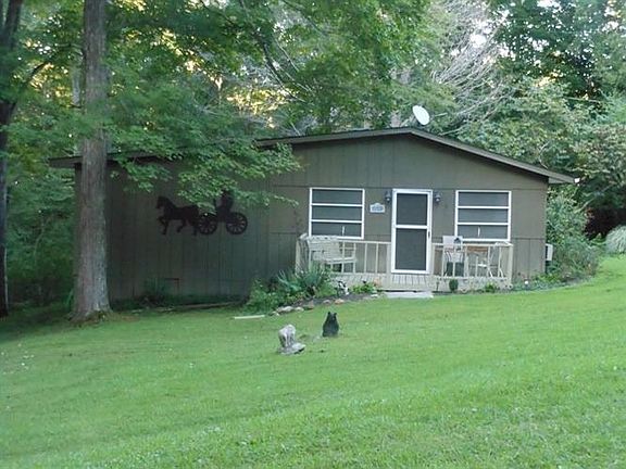 Cave Run Lake Area getaway, one story ranch cottage with open living area, kitchen with appliances, bath, city water and septic system. Wooded lot with detached garage building. Great deck for relaxing after a hike to the lake. Furniture remains, just move in!