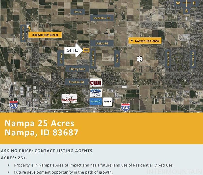 PROPERTY IS UNPRICED. 25+/- acres in Nampa's Area of Impact. The property has a future land use designation of Residential Mixed Use. The 25 +/- acres offered is currently a part of parcel number R3073400000.