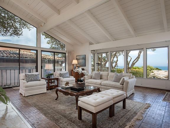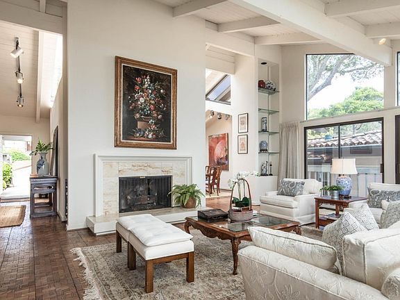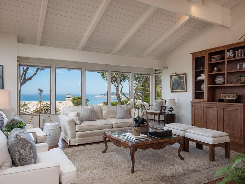 Fabulous view home tucked away in a perfect Carmel location, just 2 blocks to Carmel beach and a short stroll to downtown shops and restaurants, yet set on the quiet side of Ocean Ave with no busy traffic. Wonderful views of Carmel Bay and Pebble Beach Golf Course from the living room and master. High beamed ceilings with skylights and an abundance of windows to let the natural light stream in. Two bedrooms, two baths plus an office/study with wet bar, large dining area, two-car garage and on street parking available. Don't miss this hard to find gem!