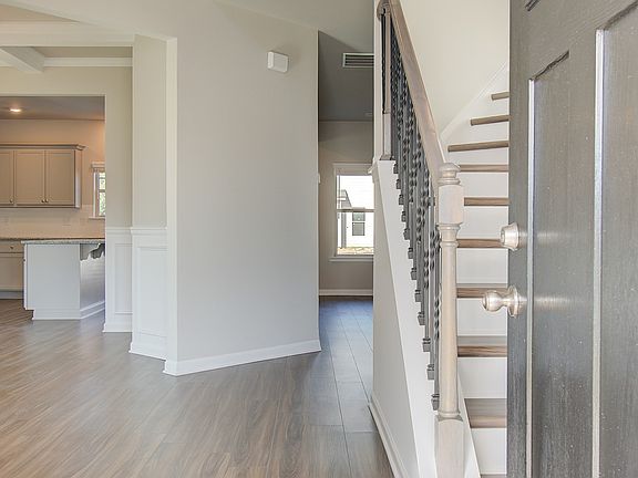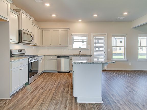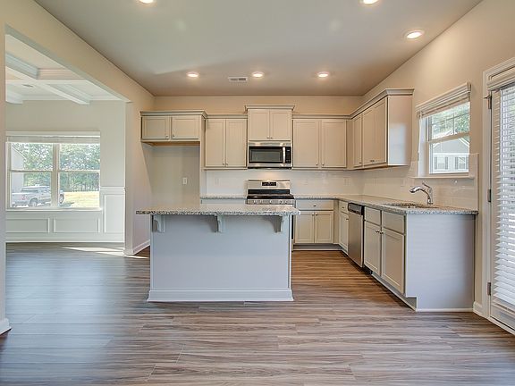 Covered front porch.Open concept kitchen with quartz countertops and an island overlooking breakfast area and family room.First level guest suite.Dining room with coffered ceilings.Primary suite with large walk-in closet, dual vanity, tub and walk-in shower.