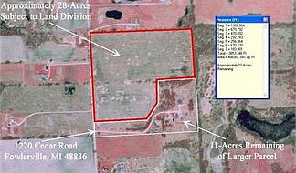 This property is approximately 28-acres in size and is primarily open and level. The parcel has not been farmed in over 25 years and is primarily overgrown with brush and a few trees. This land is very productive ground and is rated by the NRCS at 117 bushels of corn per acre. Soils consist of Berville, Breckenridge, Conover, Metamora, Miami, Ottokee, Owosso and Wesepi soil types. See attached soils map and aerial photograph. Some drain tile already in place. With some site work this property could be turned back into a productive agricultural property. The sale of this land is subject to land division and has multiple parcel numbers. The offered vacant 28-acres is part of a larger parcel with improvements and reflects taxes. Land is currently being hunted. Please contact listing agent before walking the land. Buyer to verify acreage and property features. ADDRESS: 1220 CEDAR FOWLERVILLE MI 48836Visit us at www.UCLaketoLake.comand www.UnitedCountryLifestyleProperties.comThank you for visiting United Country-Lake to Lake Realty. With offices in Richland, Michigan, South Haven, Michigan, and Canadian Lakes, Michigan, we provide real estate and auction services to all of West Michigan (Allegan, Barry, Berrien, Cass, Kalamazoo, Mecosta, Montcalm, Newaygo and Van Buren Counties). We specialize in the marketing of lakefront, waterfront, recreational, equine, farm, agriculture, rural residential, country homes, lodges, log homes, hunting and fishing properties. Richland is located in northern Kalamazoo County, northeast of Kalamazoo, and near Gull Lake, one of Michigan’s most beautiful lakes. South Haven is located on the Lake Michigan shoreline, two hours from Chicago. Canadian Lakes is located in Mecosta County, one hour north of Grand Rapids. Our offices provide cutting edge marketing of local properties to a national and worldwide audience through a network of over 3,000 owned and operated real estate and auction websites. We advertise real estate listings in national and regional magazines and newspapers, and publish our own lifestyle and specialty property catalogs. Most of our properties can be found or posted on websites found on the 1st page of Google searches. We create searchable web pages to make it easier to locate our properties on the web. When thinking of buying or selling, check us out today at www.UCLaketoLake.com, www.UnitedCountryLifestyleProperties.com, contact us at info@UCLaketoLake.com, or call 866-670-4100.
