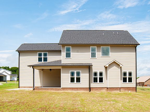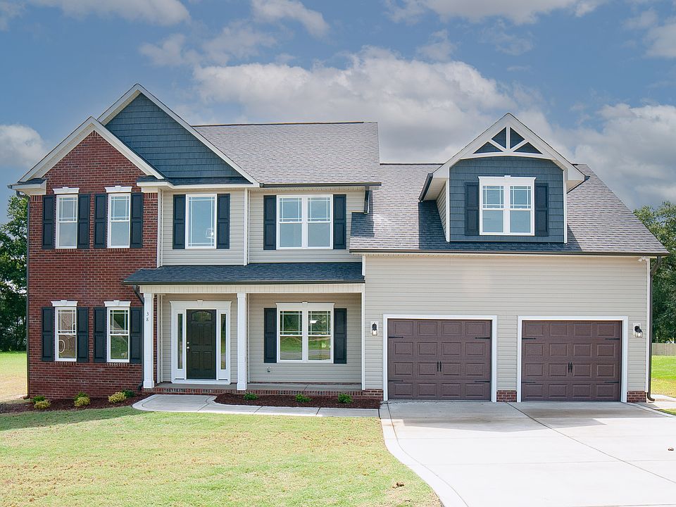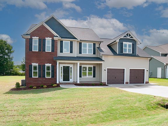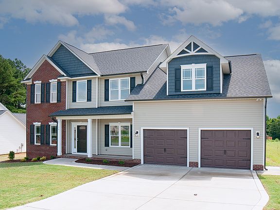 "Newport" plan with brick accent! 4 bedrooms /3 full baths; open living/dining/kitchen. 1st floor bedroom w/full bath perfect for guest suite or office. Great kitchen w/center island, walk in pantry, granite, tile backsplash and dining nook. Separate dining room w/coffered ceiling & wainscot. Living room w/gas log fireplace Huge bonus room! Owner's suite features tray ceiling w/led rope lighting accent, bath with tile shower & separate tub, dual vanity, tile flooring & walk-in closet w/custom wood shelving. Spacious secondary bedrooms. Rear porch & grilling patio for outdoor enjoyment. Custom features throughout the home set it apart from others!