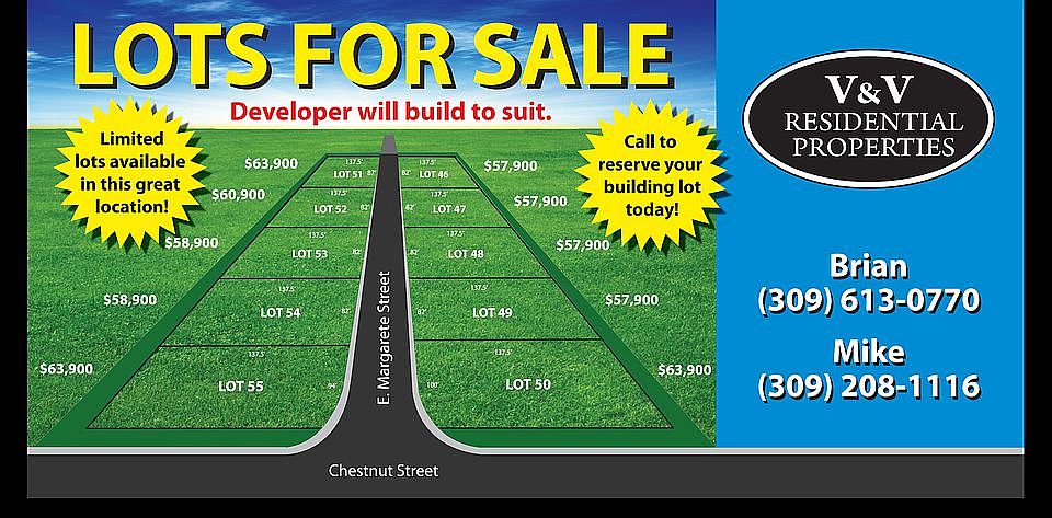 10 lots on E Margarete Street. V&V Residential Properties is excited to announce an incredibly rare opportunity to purchase a new building lot on the all new Margarete St. extension (Prairie Knolls Phase 3) in Beautiful Tremont, IL! All city amenities included - water, sewer, individual utility connections, new road, curb and street gutters! Walking distance from the beautifully updated downtown and some of the best schools in the state! We will build-to-suit and offer many modern open floor plans from which to choose - we also welcome buyers with their own plans and builders to join our neighborhood! Construction has begun on the road, come down Chestnut and take a look! Accepting deposits on lots now, hoping to close on them in September after the road is completed and pins are set.