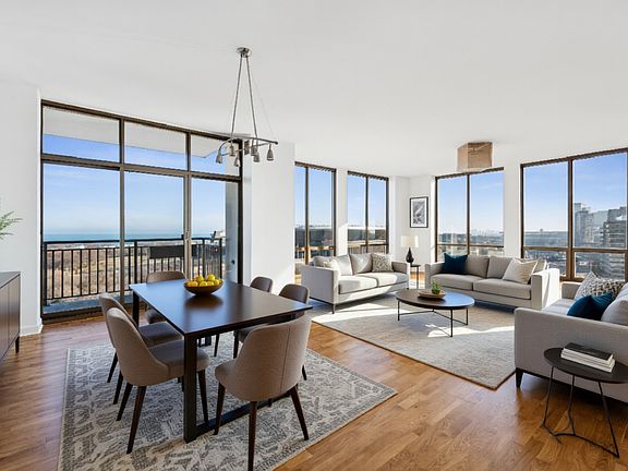 Floor-to-ceiling windowsTwo private balconiesFresh paintIn-unit laundryPanoramic lake michigan viewsSpacious pantryOpen-concept living space
