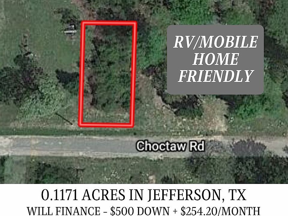 0.1171 Acres of RV/Mobile Home Friendly vacant land in Jefferson/near Lake O' the Pines. This property is perfect for you if you have an RV/mobile home OR you want property close to the lake. $5,900 with just $500 Down + $254.20/month for 24 months. Agents - Bring us a cash offer - We Pay a 5% commission! CALL/TEXT 314-710-2007 DIRECTLY FOR MOST RAPID RESPONSE! --- Property Information --- Acres: 0.1171 County: Marion State: TX Zip: 75657 GPS Coordinates: 32.777938, -94.492478