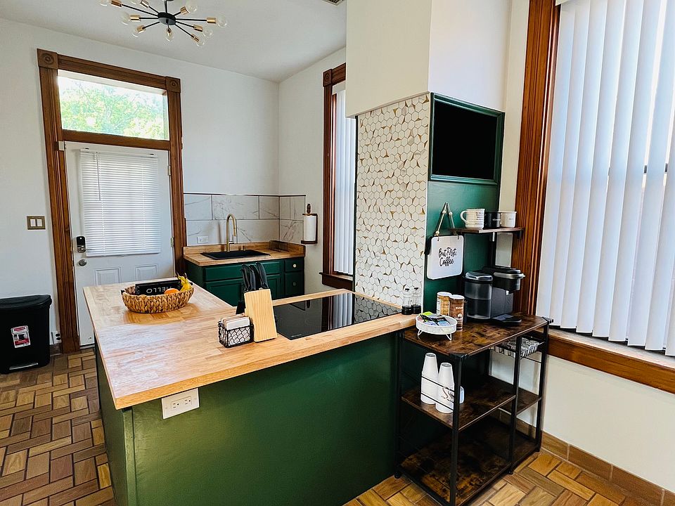 - Updated Kitchen: Equipped with new appliances, butcher block countertops, a stackable washer and dryer and plenty of cabinet space.